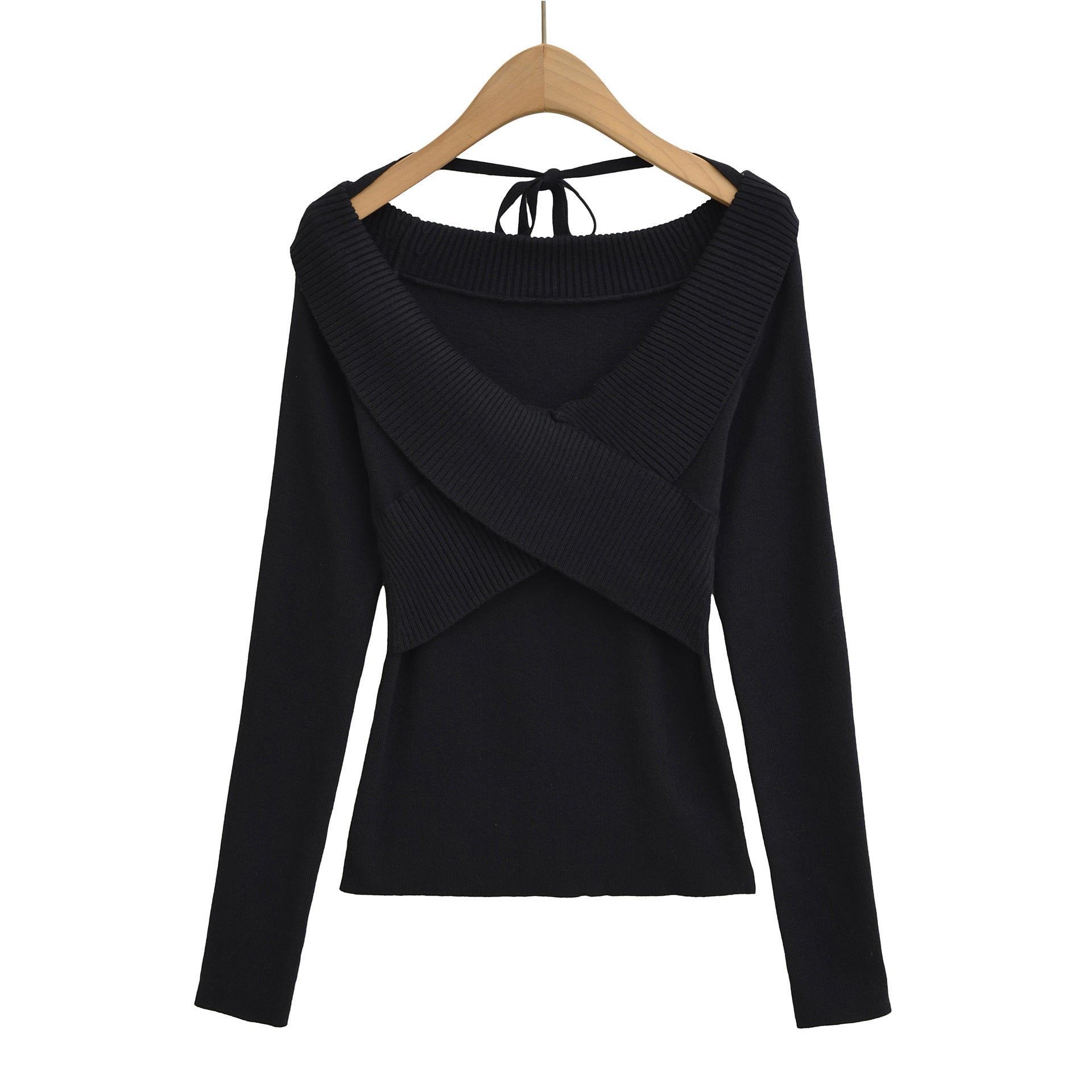 Sexy cross V-tie lead hanging neck long sleeved slim knit sweater